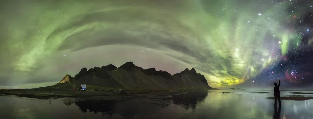 Roi Levi, a renowned astrophotographer, knows this well. In October he went to Vesterhorn Mountain in the southern part of Iceland (where a super steep mountain meets the flat, black sandy shore) and used a new photo shooting technique to get a spectacular shot of the aurora borealis and the constellation Orion together—not an easy task. Roi used a special nebula filter that blocks out most of the spectrum, letting in only the parts that come from cosmic gas clouds: hydrogen atoms and oxygen ions. The result is a better contrast between the focus of a cosmic photograph (in this case Orion) and the rest of the night sky. Basically it tones down the light you don’t want to see (think about a street light blocking the stars in a city sky), letting the subject matter shine (bad pun!). By taking photos with the lens and without it, in combination with a special app, he was able to get Orion and the lights together.