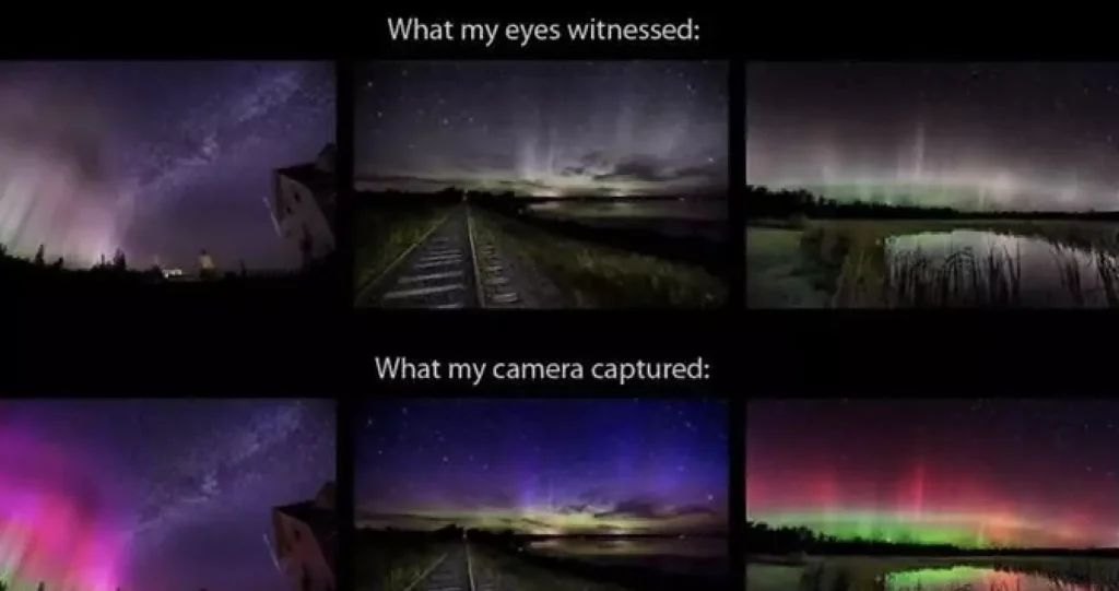 But not if you’re looking at the northern lights with your plain old eyes. The lights are too faint to be easily detected by the color-focused cells in the eye (called cones), so so they appear with less contrast and sometimes fainter in color. It is through the lens of a camera that we can see the enhanced spectrum of color.