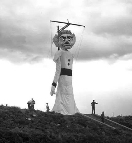 The first Zozobra burning was in 1924. Sculptor and painter William “Will” Howard Shuster Jr. created the event, according to his personal journal, as a mash-up of two experiences. The first was deciding to cheer up his depressed artist friends one night at a bar by asking them to write their bad feelings on paper napkins and then burning them in an ashtray, and the second was a trip he took to Mexico where he witnessed the Easter tradition of a paper-mache Judas, filled with firecrackers, paraded throughout the town. Combining those two ideas, he held a private party for artists and writers in the Santa Fe area and burned a six-foot version of what is now known as Zozobra.