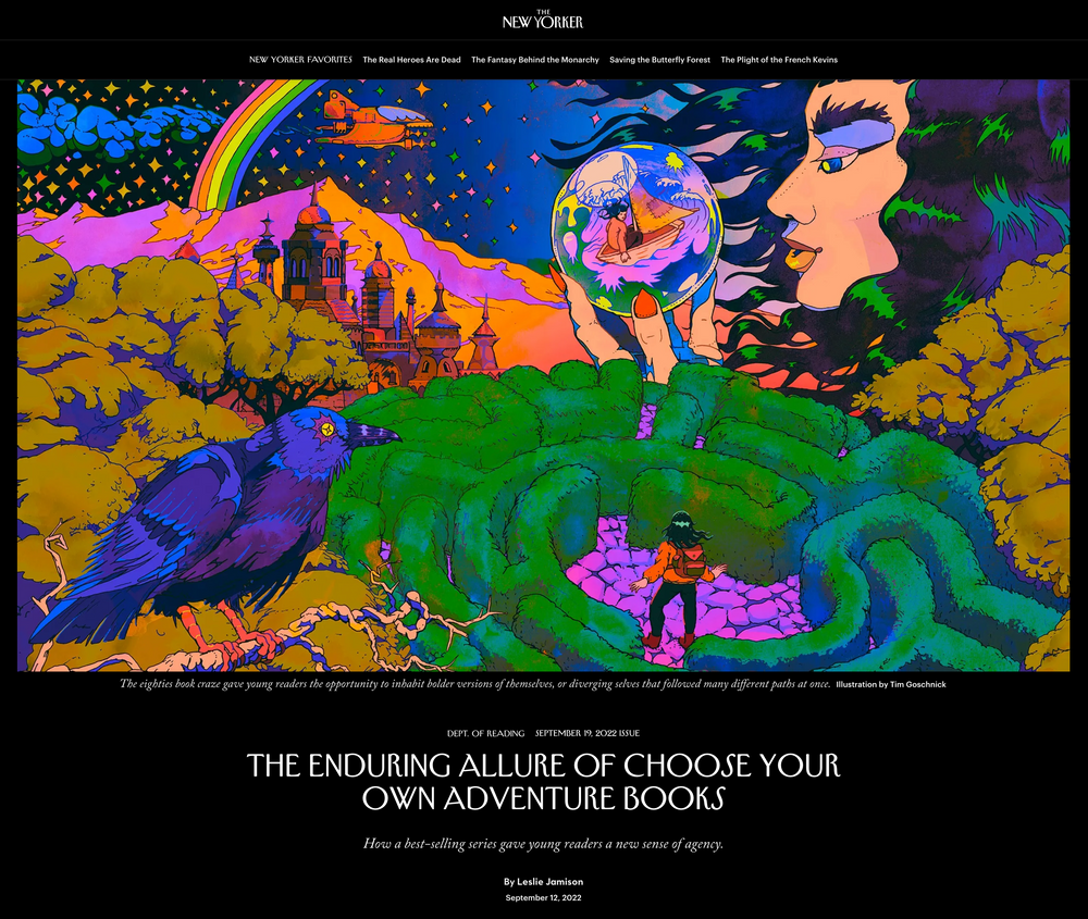 WAITSFIELD, Vt., Sep. 12, 2022 -- Chooseco was featured in an extensive (and interactive) essay in the September 12th edition of The New Yorker. We are delighted that the article highlights Choose Your Own Adventure's original success, and its continued success, as the fourth-best-selling children’s-book series of all time. We hope you enjoy reading and sharing it.