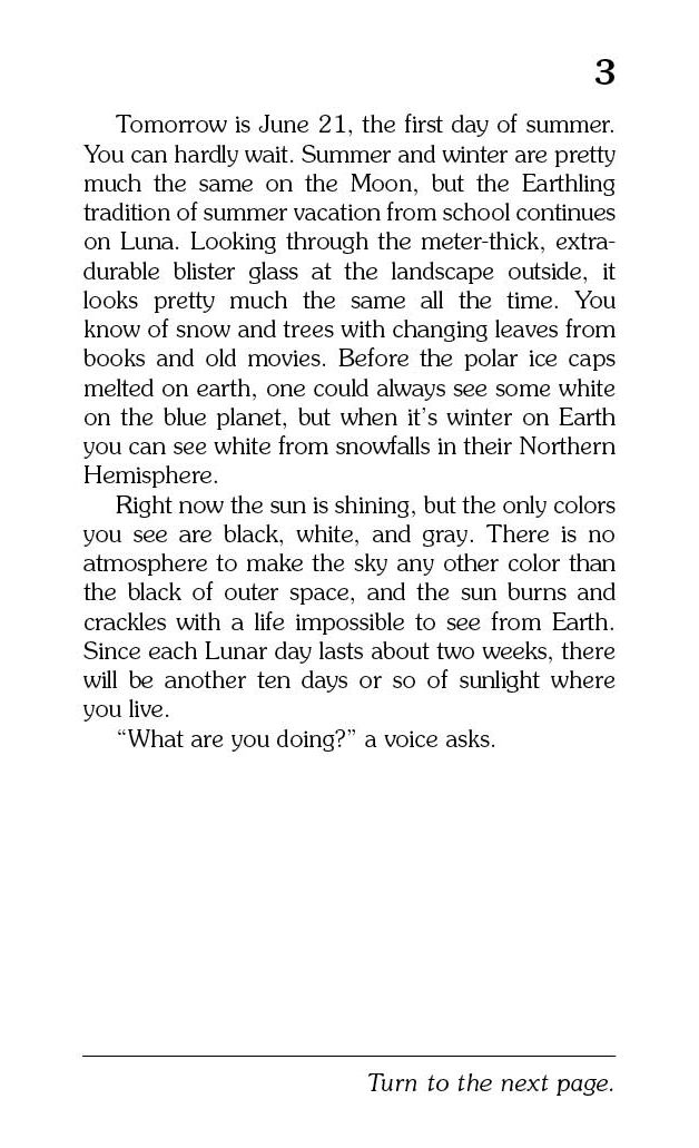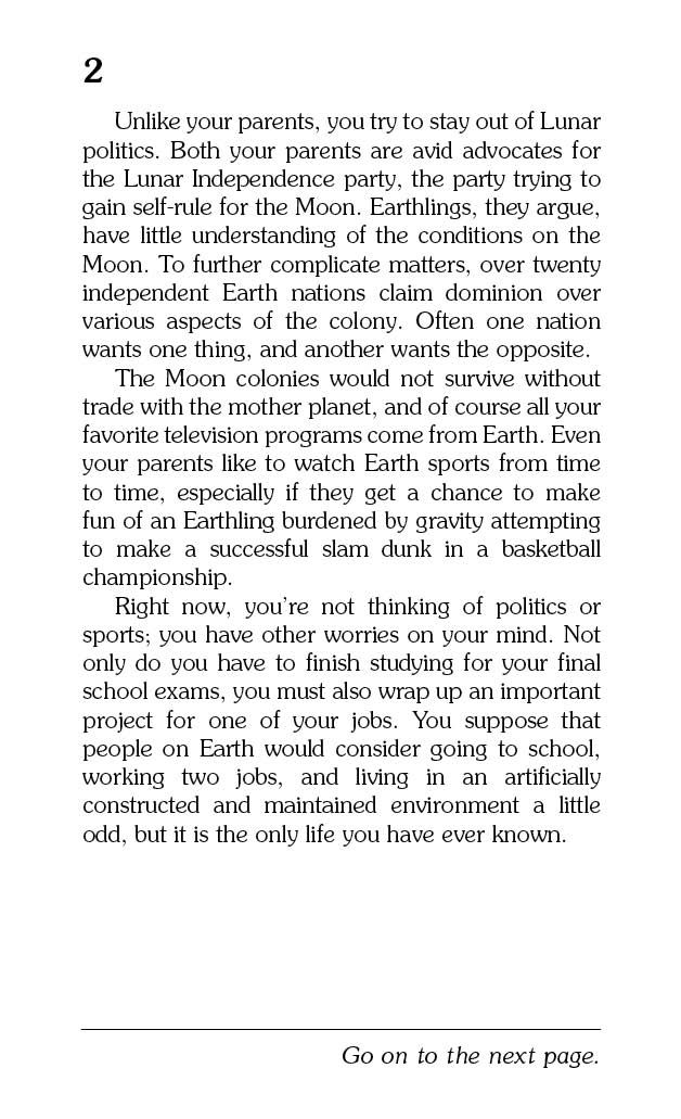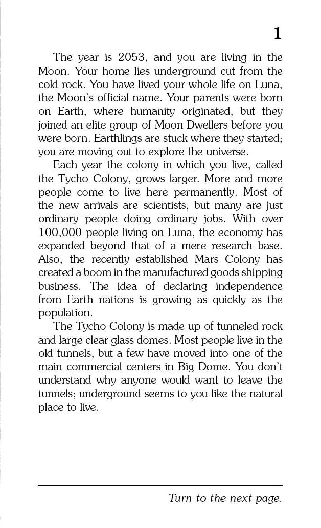 Home on the Moon is quite different from life on Earth. YOU are a part of the Tycho Colony, a young nation on the Moon. You are excited to be among the first humans living in the Tycho Colony, but the moonscape is treacherous and exploring it can be perilous. Oxygen is your lifeline. Will you have enough oxygen to traverse to the far side of the moon and make it back to the dome alive? Are you the only one outside of the dome? Or will you find other moon beings? Be careful, the choices YOU make might end in glory, disaster, or certain death.