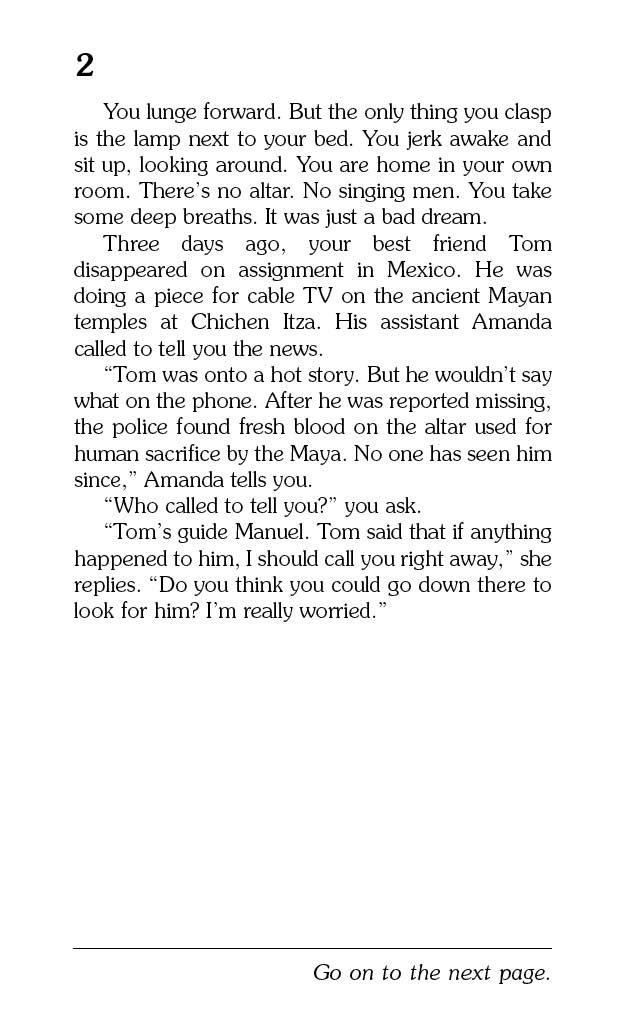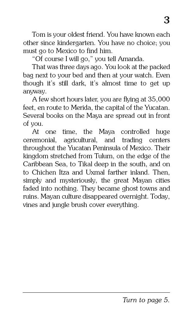 Your best friend Tom goes missing on assignment in Mexico, and YOU have to help find him. Do you take a potion that sends you back in time to the world of the Maya civilization or search for him in the present day? What secrets does Chichén Itzá hold? Will you become a great Mayan warrior or the next human sacrifice? Be careful, the choices YOU make might end in glory, disaster, or certain death.