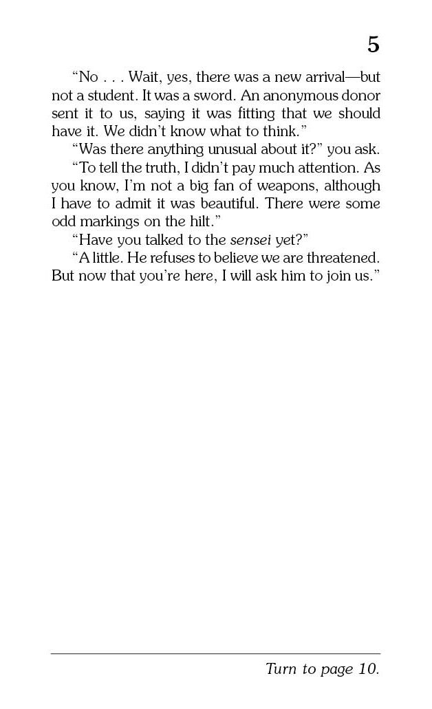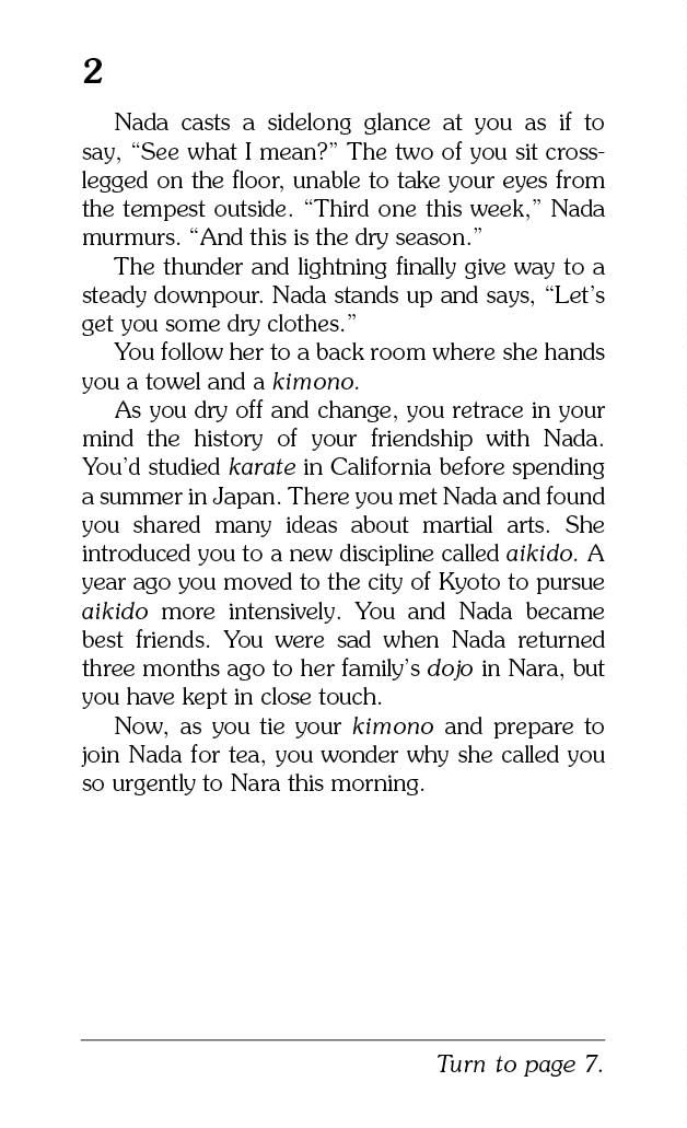 An ancient samurai sword arrives on the doorstep of your aikido dojo in Kyoto, Japan. Does the ninja sword hold magical powers that date back many decades? If you trace the history of this mystical sword, will your life be in danger? Without warning, five ninjas attack! Are they after the samurai sword or out for your head? Be careful, the choices YOU make might end in glory, disaster, or certain death.