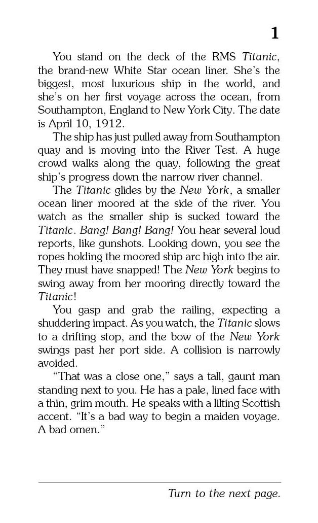 The date is April 10, 1912. Embarking on the Titanic seems like a dream. Quickly YOU learn that there is evil-doing aboard. Who can you trust? Will you be able to save the Titanic from certain doom as it careens into an iceberg? Will you be remembered as a hero or just another victim of one of the sea’s most tragic events? Be careful, the choices YOU make might end in glory, disaster, or certain death.