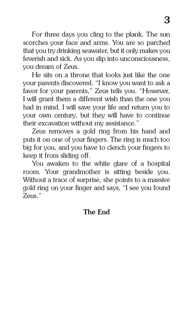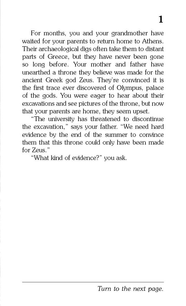 Your parents are archaeologists who believe they have unearthed the fabled Throne of Zeus, but they lack the evidence to prove it. On the summer solstice, the goddess Athena whisks YOU back in time to Ancient Greece to find the proof yourself. In your search for Zeus, will you fly with Icarus, battle the Minotaur, or swap lives with Hermes? Will you join forces with Hercules, sweep seashells for Poseidon, or play a game of fetch with the three-headed dog Cerberus? Be careful, the choices YOU make might end in glory, disaster, or certain death.