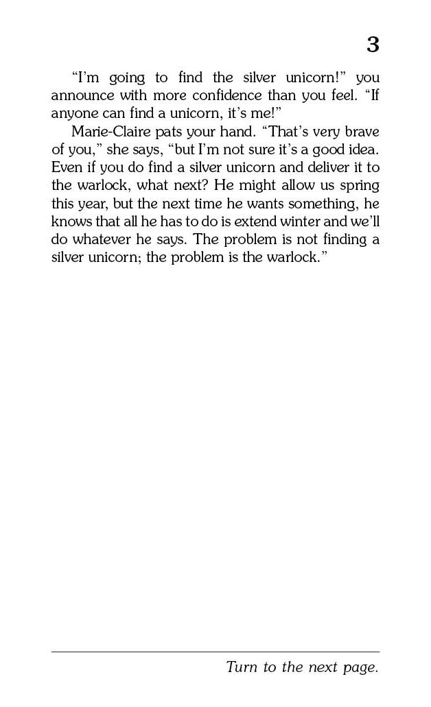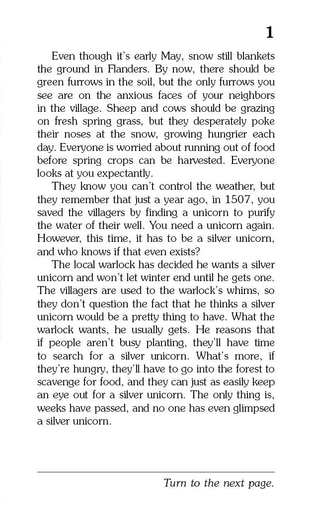An angry warlock has doomed the people of Flanders to an eternal winter. The only way he will reverse the unending snow and cold is via the gift of a silver unicorn. The problem? No one has ever seen one. Do they even exist? YOU must decide: Do you leave your village to battle the warlock on your own or do you go in search of a silver unicorn? Be careful, the choices YOU make might end in glory, disaster, or certain death.