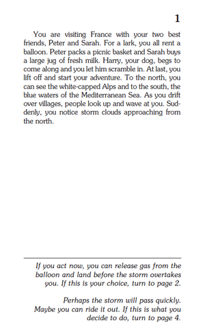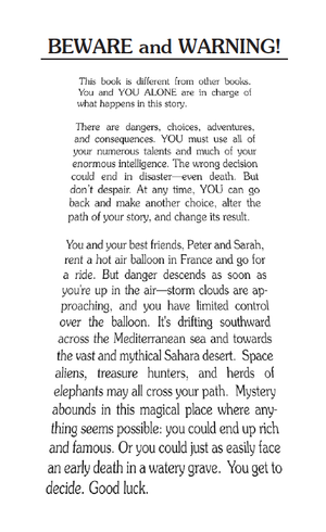 You and your friends take a hot air balloon ride while visiting France. But where will the winds of fate take you? A storm threatens to mire the balloon in the Mediterranean Sea. If you make it across the sea to Africa, will you find safety? The Sahara Desert is full of danger, wonder, and magic—treasure hunters and space aliens among them!